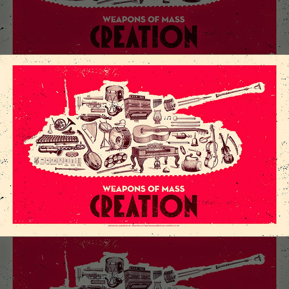 Gun crime and war-related weaponry is a huge arena for graphic protest, and the examples I found either lampooned them or contrasted guns with imagery that was innocent in order to crank up the shock value. The humorous image titled "Make Tea Not War" by Karmarama uses a vivid yellow colour scheme and a bizarre image of Tony Blair to capture the attention of the viewer. Blair's face is instantly recognisable to residents of the UK, America and much of Europe, so was an effective device in emotional and connotative anchoring. The teacup on his head not only makes him look ridiculous but makes the view of the artist clear - war is stupid. The "tea" element is of course very British, so resonates with locals of the UK where the poster was made.